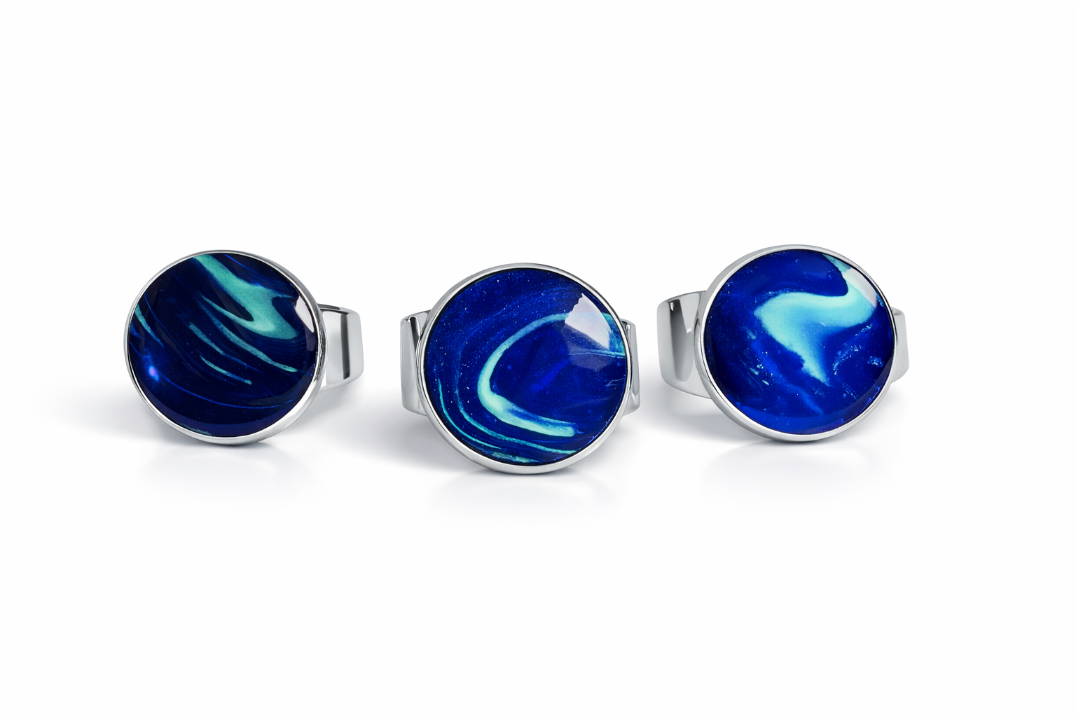 Käsin tehdyt AURORA-korut ovat syntyneet revontulien inspiroimana. Kiiltävä hartsipinta syventää sävyt ja UV-valossa korun värit hehkuvat kuin yötaivaan valonäytös – jokainen pari on oma, uniikki yksilönsä.