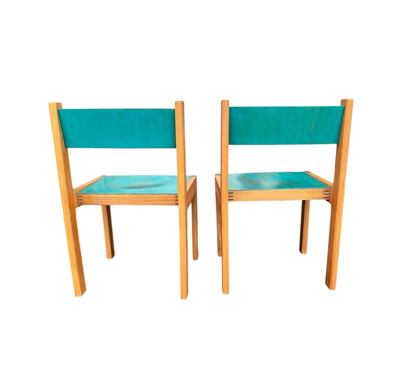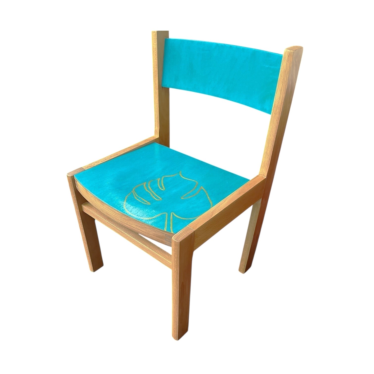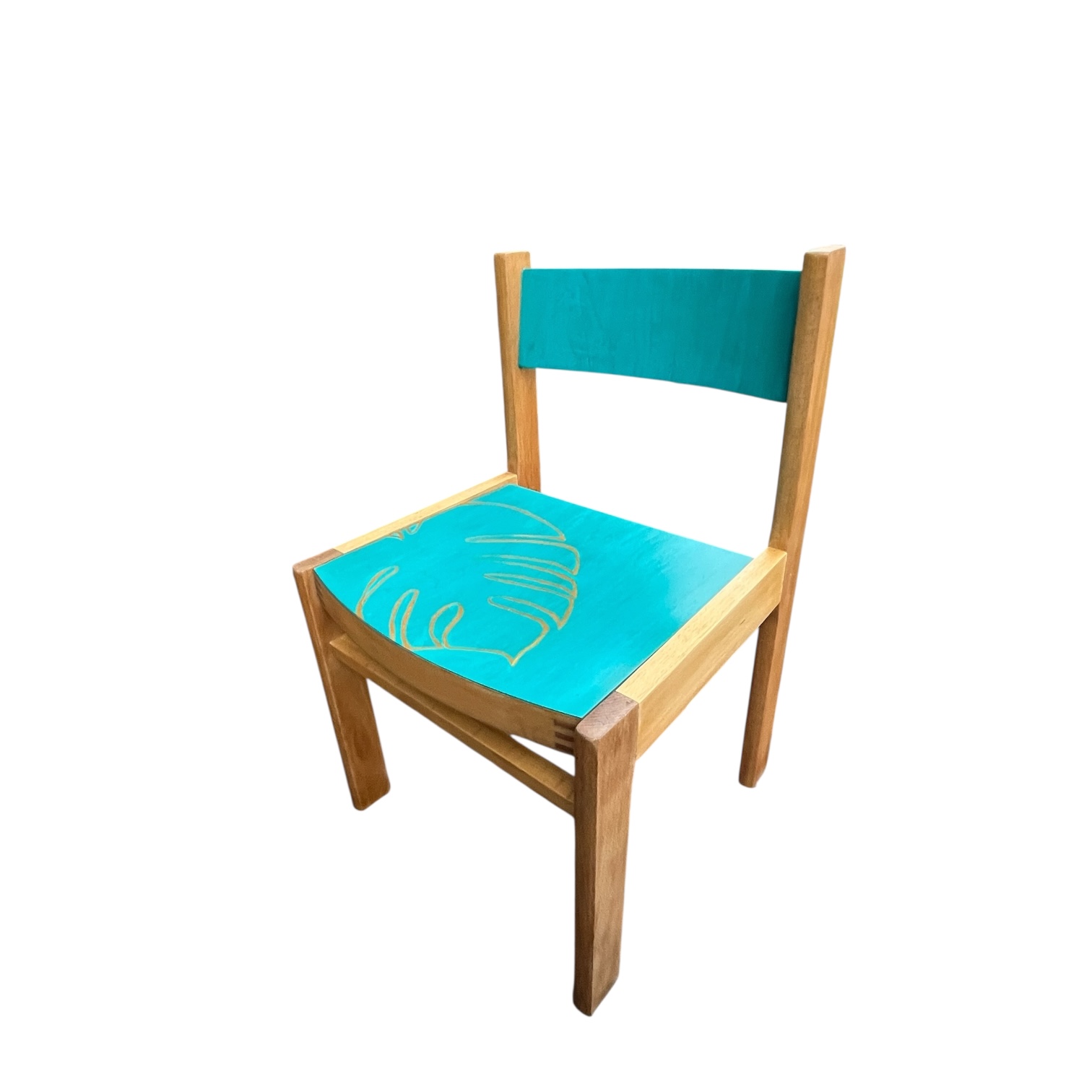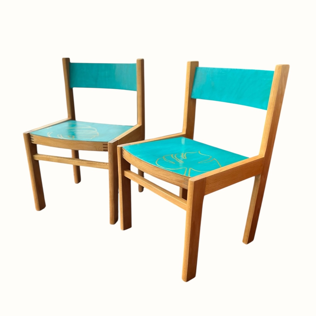 Nämä suloiset ja jämäkät lasten tuolit on kunnostettu rakkaudella ja maalattu pirteän turkoosiksi, tuomaan iloa ja väriä lastenhuoneeseen. Tuolissa on käsin maalattu peikonlehti, joka vie ajatukset viidakkoseikkailuun ja innostaa mielikuvitusleikkeihin. Turkoosi maali on MIGIAn valmistama perinteinen öljymunatempera maali, joka elää luonnonvalon mukaan. Kulutusta ja katseen kestävä pinta. Nämä kaksi valmistettua tuolia ovat uniikkeja ja ainoat saatavilla olevat kappaleet.