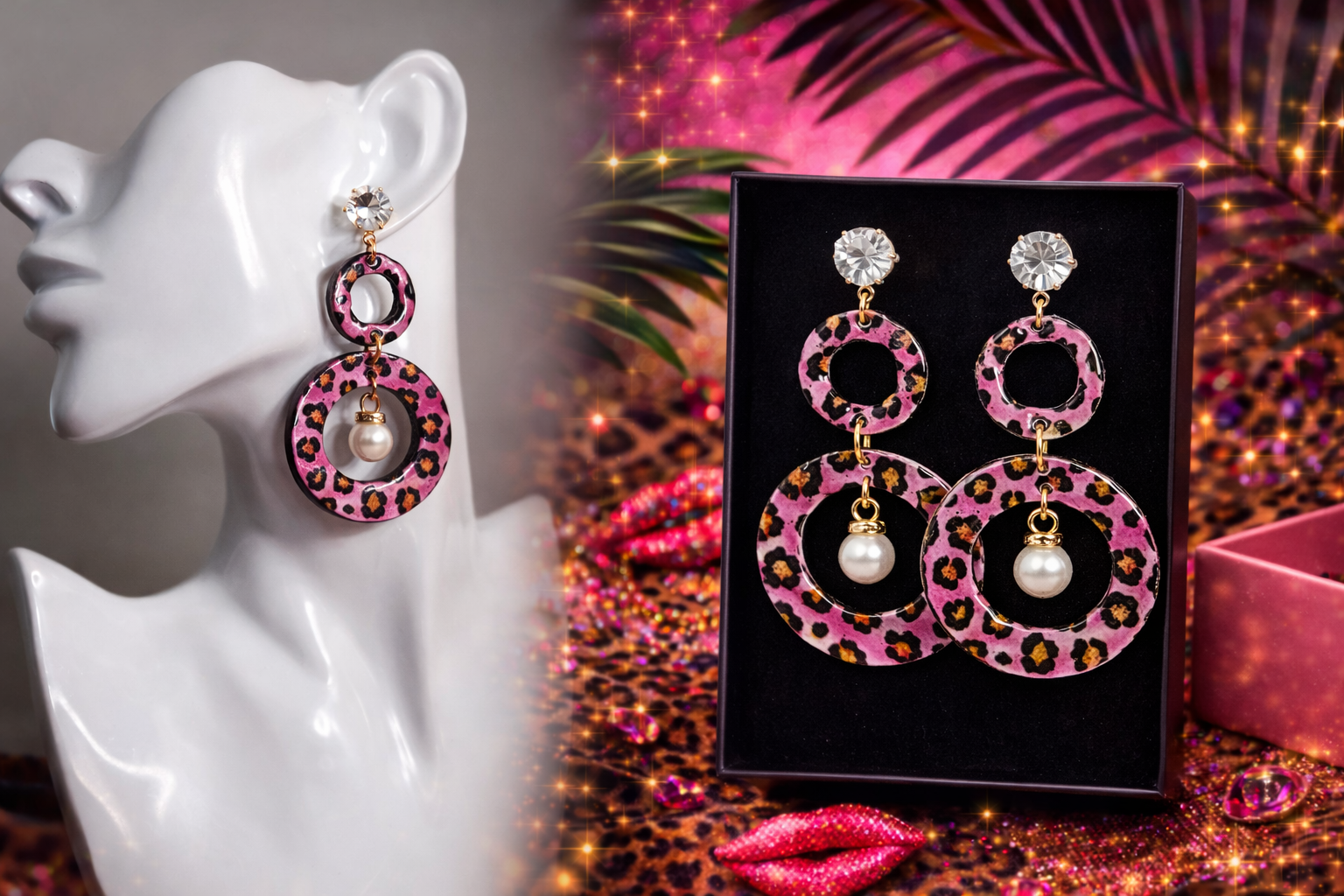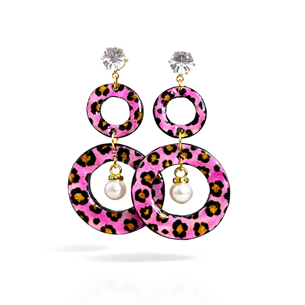 Näyttävät mutta kevyet korvakorut, joissa yhdistyy rohkea pinkki leopardikuosi ja elegantti helmi. Kimaltava yläosa tuo ripauksen luksusta, ja liikkuva muoto tekee koruista elävät ja katseenvangitsevat. Korun takaosat mustaa samettia. Koru toimitetaan MIGIAn korurasiassa. Täydellinen valinta, kun haluat erottua – arjessa tai juhlassa.